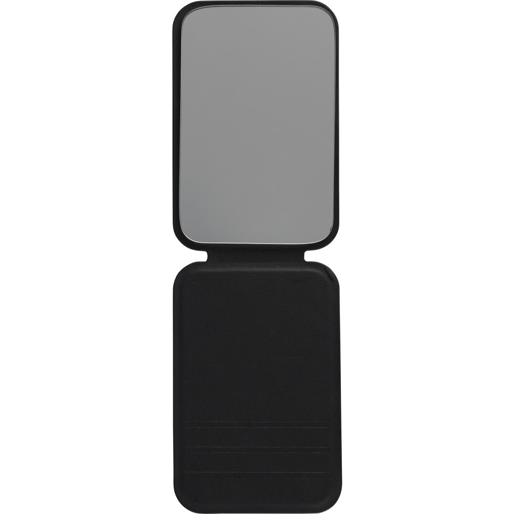 Üvegtükör összehajtható, újrahasznosított PU borítással, amely kinyitva álló helyzetben használható. A borításon dombornyomott, újrahasznosított alapanyagra utaló logó található. Papírtasakba csomagolva.